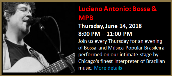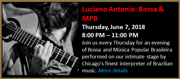 Join us every Thursday for an evening of Bossa and Música Popular Brasileira performed on our intimate stage by Chicago's finest interpreter of Brazilian music.