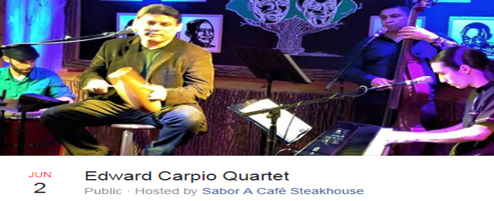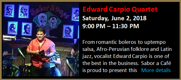 From romantic boleros to uptempo salsa and Latin jazz, vocalist Edward Carpio is one of the most entertaining singers in the business. Sabor a Café is proud to present this great singer in an intimate quartet format.