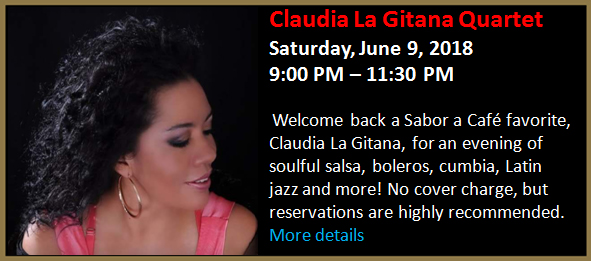 Welcome back a Sabor a Café favorite, Claudia La Gitana, for an evening of soulful salsa, boleros, cumbia, Latin jazz and more!