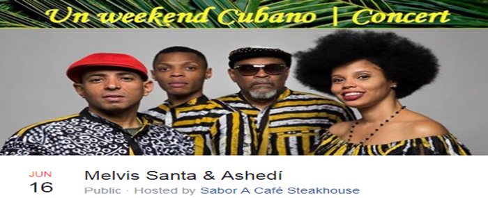 It's part of a Weekend of Afro-Cuban music at Sabor a Café that includes Melvis Santa and Ashedí in concert on Saturday, June 16 at 9pm (https://www.facebook.com/events/2077250675822265/) and an Afro-Cuban Percussion and Dance Workshop Sunday morning at 11am. (https://www.facebook.com/events/442178726222581/)
