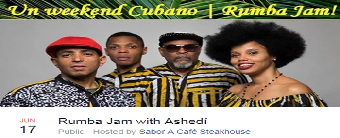 It's part of a Weekend of Afro-Cuban music at Sabor a Café that includes Ashedí conducting an Percussion and Dance Workshop on Sunday, June 17 at 11am (https://www.facebook.com/events/442178726222581/) and leading a Rumba Jam Session Sunday night at 8pm. (https://www.facebook.com/events/191664044809164/)