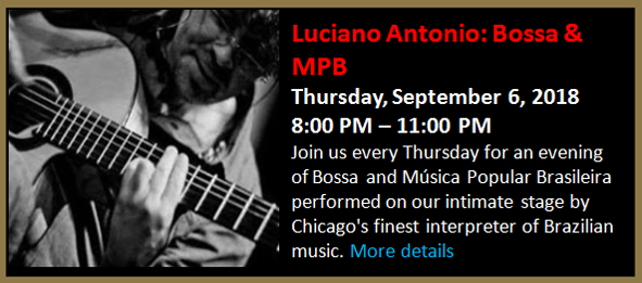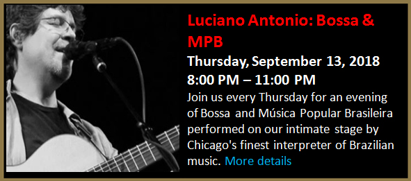 Join us every Thursday for an evening of Bossa and Música Popular Brasileira performed on our intimate stage by Chicago's finest interpreter of Brazilian music.