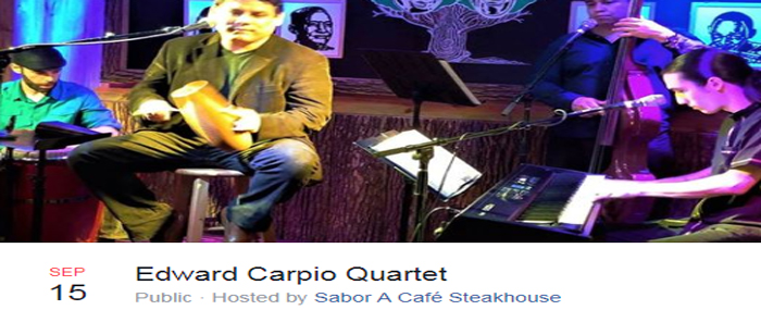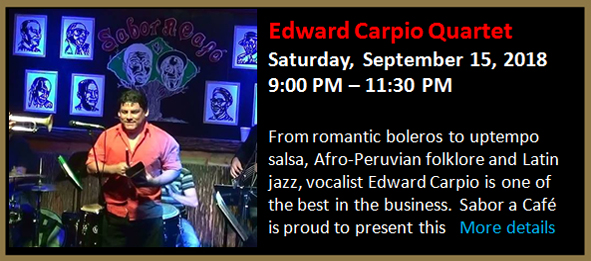 From romantic boleros to uptempo salsa and Latin jazz, vocalist Edward Carpio is one of the most entertaining singers in the business. Sabor a Café is proud to present this great singer in an intimate quartet format.