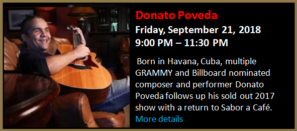 Born in Havana, Cuba, multiple GRAMMY and Billboard nominated composer and performer Donato Poveda follows up his sold out 2017 show with a return to Sabor a Café.