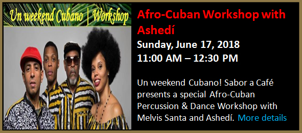 It's part of a Weekend of Afro-Cuban music at Sabor a Café that includes Melvis Santa and Ashedí in concert on Saturday, June 16 at 9pm (https://www.facebook.com/events/2077250675822265/) and an Afro-Cuban Percussion and Dance Workshop Sunday morning at 11am. (https://www.facebook.com/events/442178726222581/)