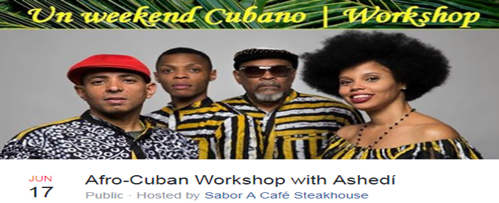 It's part of a Weekend of Afro-Cuban music at Sabor a Café that includes Ashedí conducting an Percussion and Dance Workshop on Sunday, June 17 at 11am (https://www.facebook.com/events/442178726222581/) and leading a Rumba Jam Session Sunday night at 8pm. (https://www.facebook.com/events/191664044809164/)