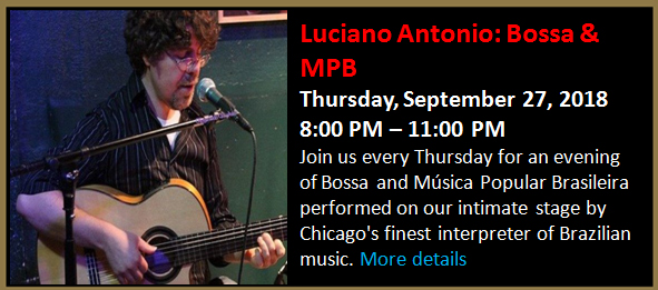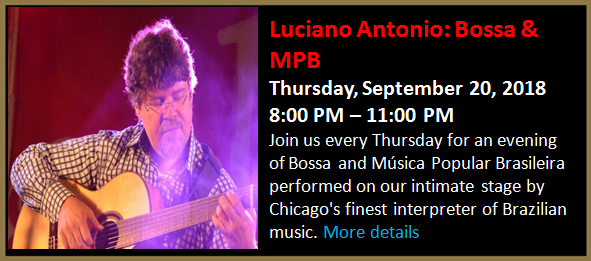 Join us every Thursday for an evening of Bossa and Música Popular Brasileira performed on our intimate stage by Chicago's finest interpreter of Brazilian music.