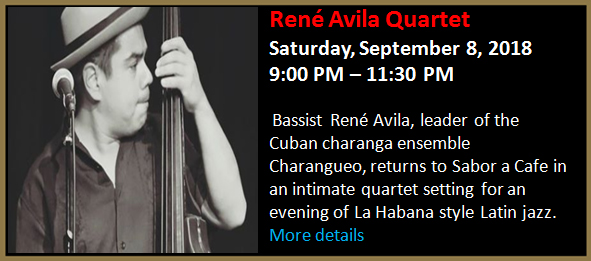 Bassist René Avila, leader of the Cuban charanga ensemble Charangueo, returns to Sabor a Cafe in an intimate quartet setting for an evening of La Habana style Latin jazz.